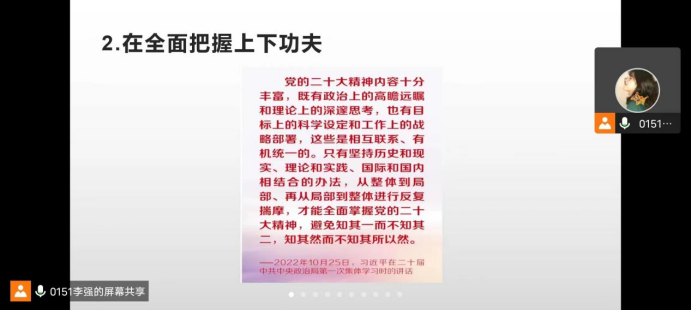研究生第四党支部委员李强结合习近平总书记在二十届中共中央政治局第一次集体学习上的重要讲话,带领支部成员学习党的二十大精神。会议表示,习近平总书记在主持学习时强调,全党要在全面学习、全面把握、全面落实上下功夫,这就要求我们要原原本本学习报告,同时要把学习大会报告同学习大会系列重要讲话和相关文件结合起来,同学习党的十八大报告、十九大报告精神结合起来,联系着学;其次,要全面把握新时代中国特色社会主义思想的世界观、方法论和贯穿其中的立场观点方法,深刻领会“两个结合”、“六个坚持”,正确认识把握新时代中国特色社会主义思想的精神实质;最后,要分清轻重缓急,既要全面推进,又要突出重点;既要狠抓当前,又要着眼长远,多办打基础、利长远的事,防止搞形式主义、官僚主义。