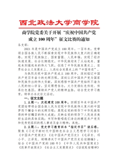 为热烈庆祝中国共产党成立100周年,深刻铭记中国共产党百年奋斗的光辉历程,深刻认识中国共产党为国家和民族作出的伟大贡献,深刻感悟中国共产党始终不渝为人民的初心宗旨,坚定理想信念,大力发扬红色传统、传承红色基因,赓续共产党人的精神血脉,结合党史学习教育,太阳成tyc234cc党委于近日专门下发通知,举办“庆祝中国共产党成立100周年”征文活动。本次征文活动面向全院师生,旨在学院内形成学党史、强信念、跟党走的热烈氛围。