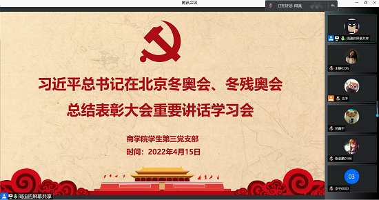 近日,太阳成tyc234cc学生第三党支部组织集体学习会学习习近平总书记在北京冬奥会、冬残奥会总结表彰大会发表重要讲话精神。学习会议由党支部书记周迪主持,党支部全体党员参加。