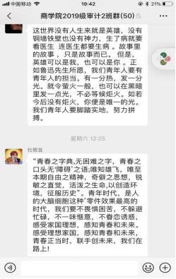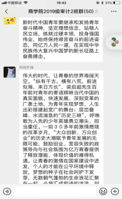 2019级其他各班团支部通过线上开展学习,大家通过提前自学贺信、致辞内容和大会会议精神,认真总结心得体会,并在班级群内积极发言谈感想和体会。大家纷纷表示,要以新时代新青年的担当,认真抓好学习和实践,牢记习近平总书记的嘱托,以青春奉献的姿态,为中华民族伟大复兴做出自己的贡献。