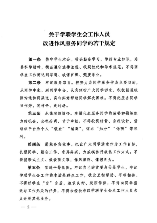 以下为关于学联学生会工作人员改进作风服务同学的若干规定具体内容: