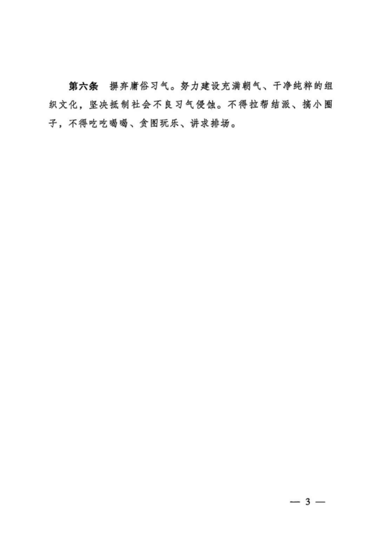 第六条摒弃庸俗习气。努力建设充满朝气、干净纯粹的组织文化,坚决抵制社会不良习气侵蚀。不得拉帮结派、搞小圈子,不得吃吃喝喝、贪图玩乐、讲求排场。