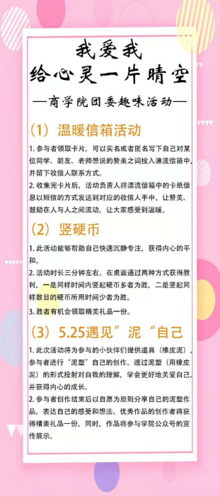 每年的5月25日是全国大学生心理健康日,“5·25”的谐音即为“我爱我”,提醒大学生“珍惜生命,关爱自己”。