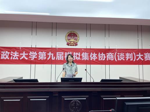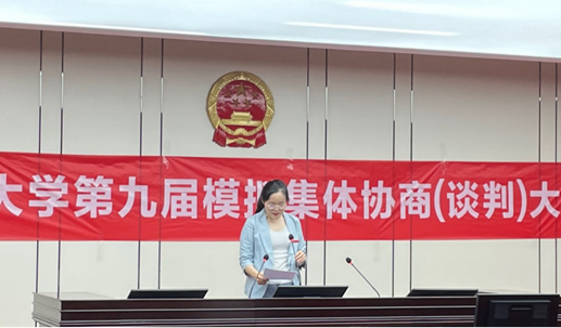 比赛开始前,王鹏飞致开幕词。她强调了模拟谈判大赛的重要意义,指出模拟谈判大赛不仅是一项提高我国劳动关系人才专业素质与能力的比赛,也是一项考验人格魅力和逻辑思维的比赛。她希望同学们能够通过本次大赛,将理论知识与市场需求相结合,为培养新型的学习、就业理念打下坚实的基础。