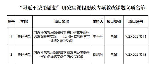 近日,研究生院组织开展了2024年“习近平法治思想”研究生课程思政专项教改课题,经个人申报、形式审查、专家评审、公示等环节,最终我院2项成果获批立项。立项名单如下: