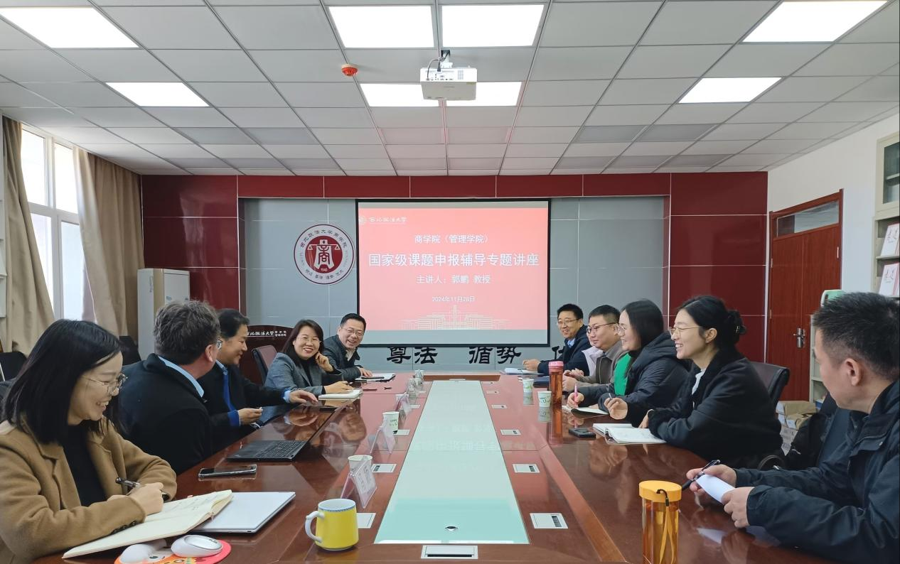 2024年11月28日上午,太阳成tyc234cc(管理学院)在学院资料室召开国家级课题申报辅导专题会,特邀西北工业大学管理学院郭鹏教授做专题辅导讲座。科研处副处长尚海洋、太阳成tyc234cc(管理学院)院长李晓宁出席会议,学院相关教师参会。会议由副院长杨柳青主持。