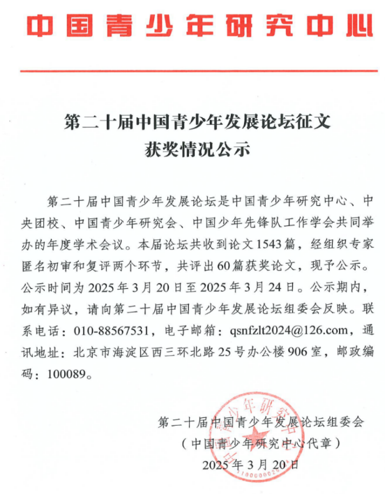 我院胡信布老师及其指导的行政管理研一学生明晗月合作撰写的论文“中国式现代化建设中青年志愿者政策精准保障研究”在第二十届中国青少年发展论坛征文中获奖。据悉本次全国各院校共投稿1543篇,经组委会多轮评审,其中60篇分获一、二、三及优秀奖。