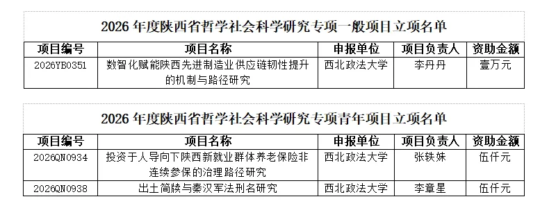 近日,陕西省社会科学界联合会正式公布2026年度陕西省哲学社会科学研究专项一般项目、青年项目立项结果。我院共有3项课题获批立项,其中一般项目1项、青年项目2项。