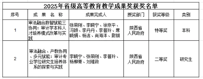 近日,陕西省人民政府办公厅正式发布《关于表彰2025年高等教育教学成果奖获奖项目的通报》,我院在本次评选中斩获佳绩,张荣刚教授教学团队成果《审法融合数智赋能三方协同:审计学本科人才培养模式改革与实践》获本科特等奖。李晓宁教授教学团队成果《审法融合、产教协同、多元赋能:审计专业学位研究生培养体系的探索与实践》获研究生二等奖,实现本科教育与研究生教育双领域突破,充分彰显了我院在高等教育教学改革、审法融合培养方面显著成效。既是学院教学科研实力的有力见证,更是学校深耕教育教学改革、夯实人才培养根基的集中体现。