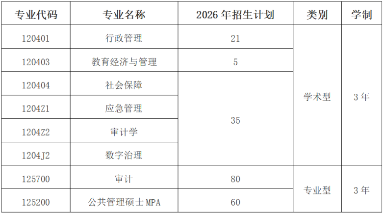 学院学科专业齐备。学院依托公共管理一级学科,形成“6+2”硕士点体系,分别是行政管理、审计学、教育经济与管理、社会保障、数字治理、应急管理等6个学术学位硕士授权点,以及审计(Maud)、公共管理(MPA)2个专业学位硕士授权点。目前,学院在校生1200余人,其中硕士硕士研究生556人;2026年学院硕士研究生计划招生201人。