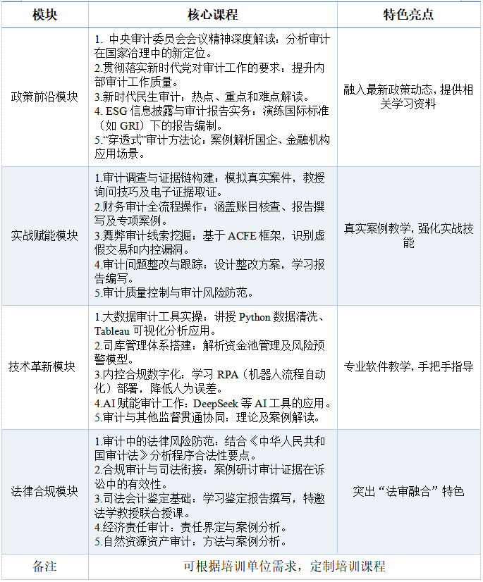 深入贯彻习近平总书记关于审计工作的重要讲话重要指示精神,紧扣国家审计政策要求,将审计理论与实务相结合,融合ESG审计、大数据审计技术等前沿领域,聚焦国家审计、内部审计、社会审计业务,特别是审计法治、民生审计、环境资源审计、企业合规审计实务中的难点与技术问题,塑造审计职业精神,建设忠诚、干净、担当的高素质专业化审计干部队伍,助力新时代审计工作高质量发展。