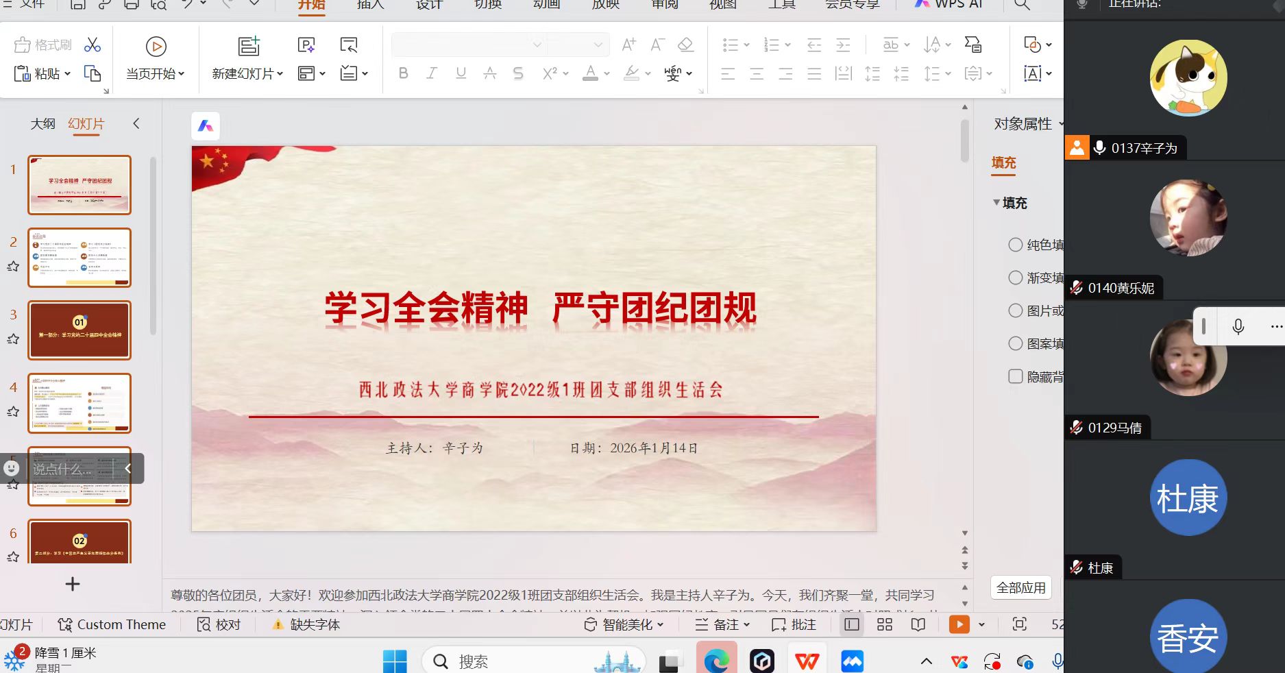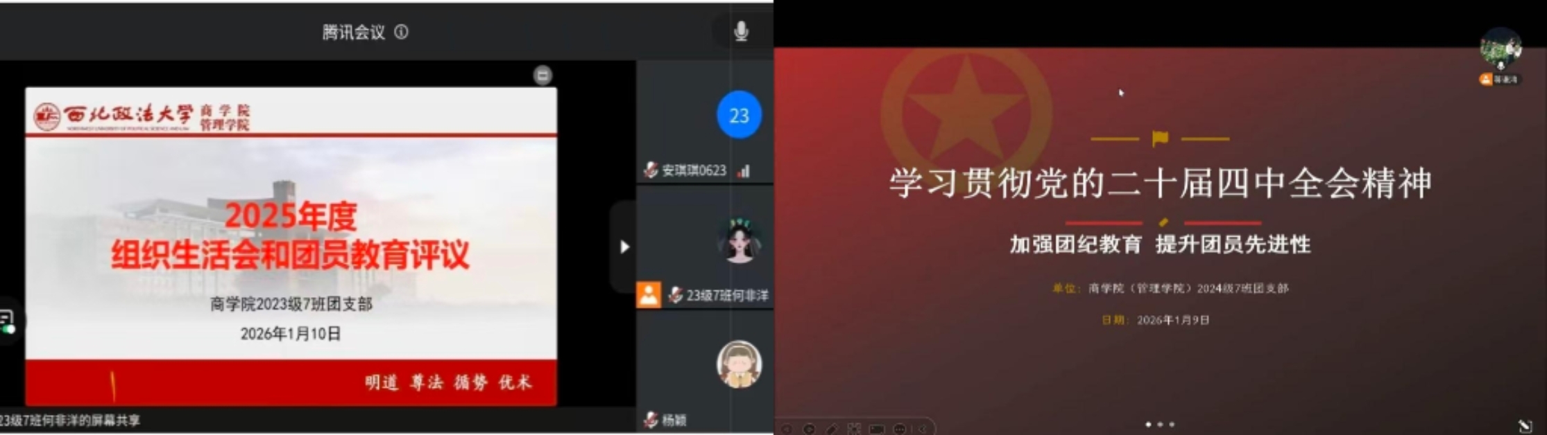 各团支部紧扣“学习贯彻党的二十届四中全会精神,加强团纪教育,提升团员先进性”这一主题,立足专业特色与支部特点,严格按照组织程序规范开展工作,确保会议内容充实、成效扎实。各支部通过原文领学、交流研讨等方式,组织支部团员学习党的二十届四中全会精神、习近平总书记重要贺信精神、习近平总书记对未成年人思想道德建设作出的重要指示精神、《求是》杂志重要文章《推进党的自我革命要做到“五个进一步到位”》、《中国共产主义青年团章程》和团纪教育等内容,领会习近平总书记对青年挺膺担当的殷切嘱托,有效提升了团员的政治素养和理论学习能力。