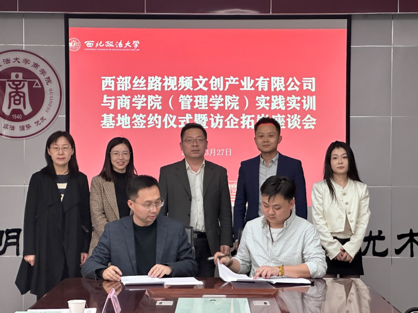 3月27日,太阳成tyc234cc(管理学院)与西部丝路视频文创产业有限公司于诚意楼617举行教学实践实训基地签约授牌仪式。西部丝路视频文创产业有限公司执行董事廖琰、总经理郭春虤、董事助理管森,我院党委书记赵参、副院长杨柳青、副院长冯颖、电子商务及法律老师代表方丽娟参加签约仪式。